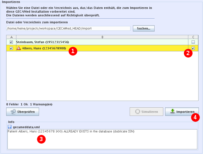 Während des Simulations-Vorganges wird überprüft, ob in den Import-Dateien vorghandene Patient schon in der GECAMed Datenbank vorhanden sind. Dies wird über die Sozialversicherungsnummer geprüft. Solche Patienten werden nach dem Lauf der Simulation mit gelben Hintergrund in der Liste hinterlegt