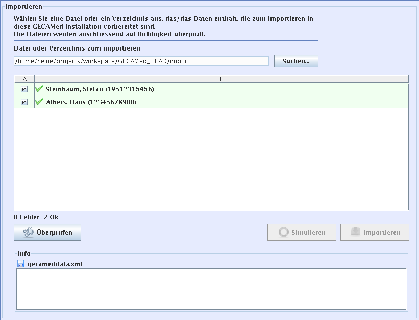 Der Import-Vorgang liest die Daten aus den Import-Dateien aus und speichert diese auf dem GECAMed Server. Die „Importieren“ Schaltfläche ist erst nach einer durchgeführten Simulations frei geschaltet. Eine erneute „Überprüfung“ setzt den Zustand wieder zurück und Sie müssen die Simulation erneut durchführen. Je nachdem wie viele einzelne Patienten-Daten Sie importieren, kann dies einige Zeit dauern.
