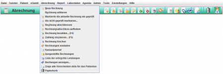 Oben rechts in der Titelleiste des Abrechnungsmoduls befinden sich die Schaltflächen für die geläufigsten Operationen im Abrechnungsmodul. Sie sind ebenfalls über das „Abrechnen“ Menü erreichbar. Im Folgenden wollen wir einen kurzen Überblick über diese Operationen geben.